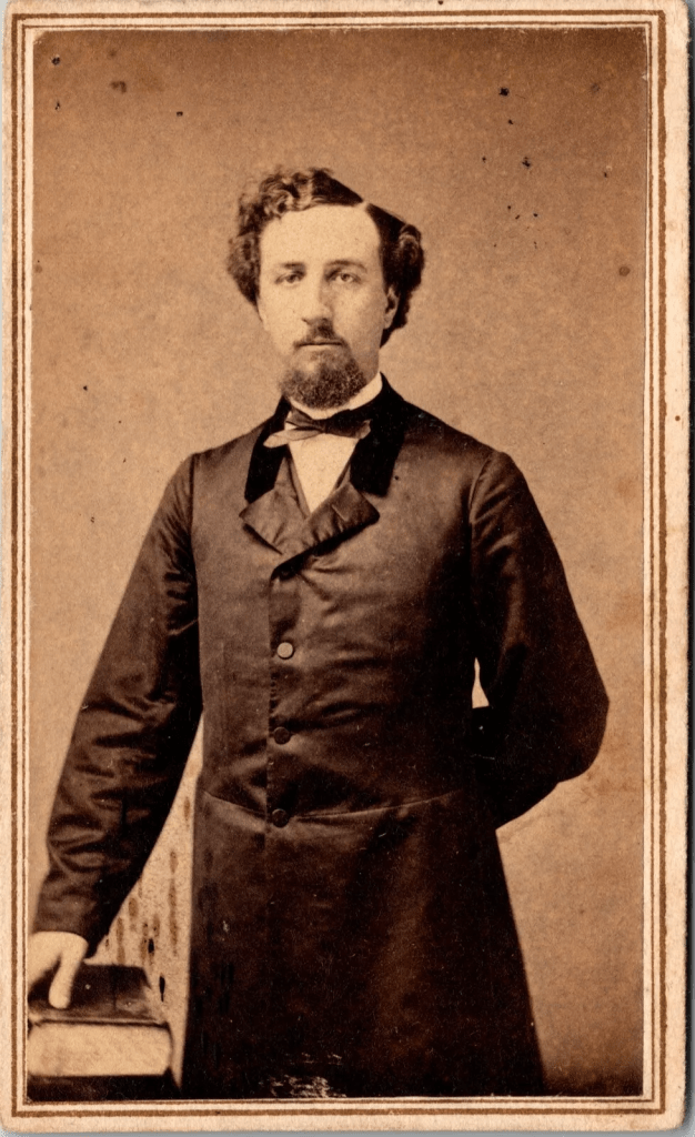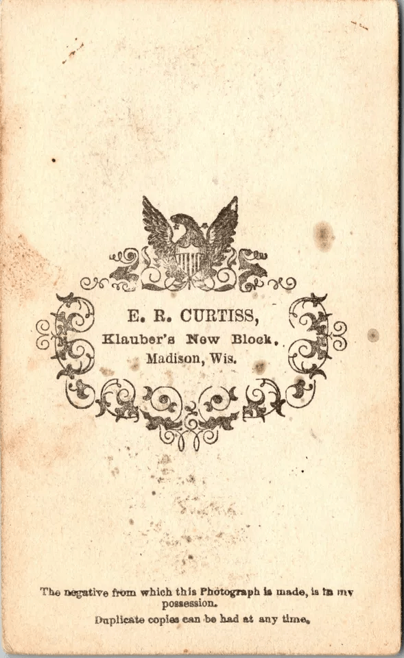 This carte de visite portrait features a short bearded well dressed gentleman. The cdv photograph was taken by Edwin Rodney Curtiss (1836-1906). He operated a photo studio in Madison, Wisconsin. Curtiss was born in Southington, Connecticut and married Eva A. Lingenfetler of Fonda, New York in 1859.