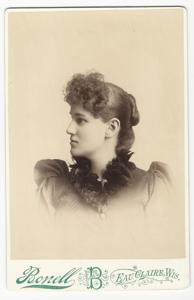 This cabinet card portrait features a pretty young woman named Jennie Hall Hutchins. The identification is made by an inscription on the reverse of the photograph. The inscriber describes her as “Grandpa’s half sister”. Preliminary research did not yield any further information about Miss Hutchins. The photographer of this image is no stranger to the Cabinet Card Gallery. At the time of this writing, the gallery has four other photographs by Frederick Bonell. In addition to having a studio in Eau Claire (the location where this photograph was taken), he also conducted business in Chippewa Falls, Wisconsin. One source states that Bonell worked as a photographer between 1879 and 1890. To view other photographs by Bonell, click on the category “Photographer: Bonell”. This cabinet card portrait is in very good condition (see scans).
