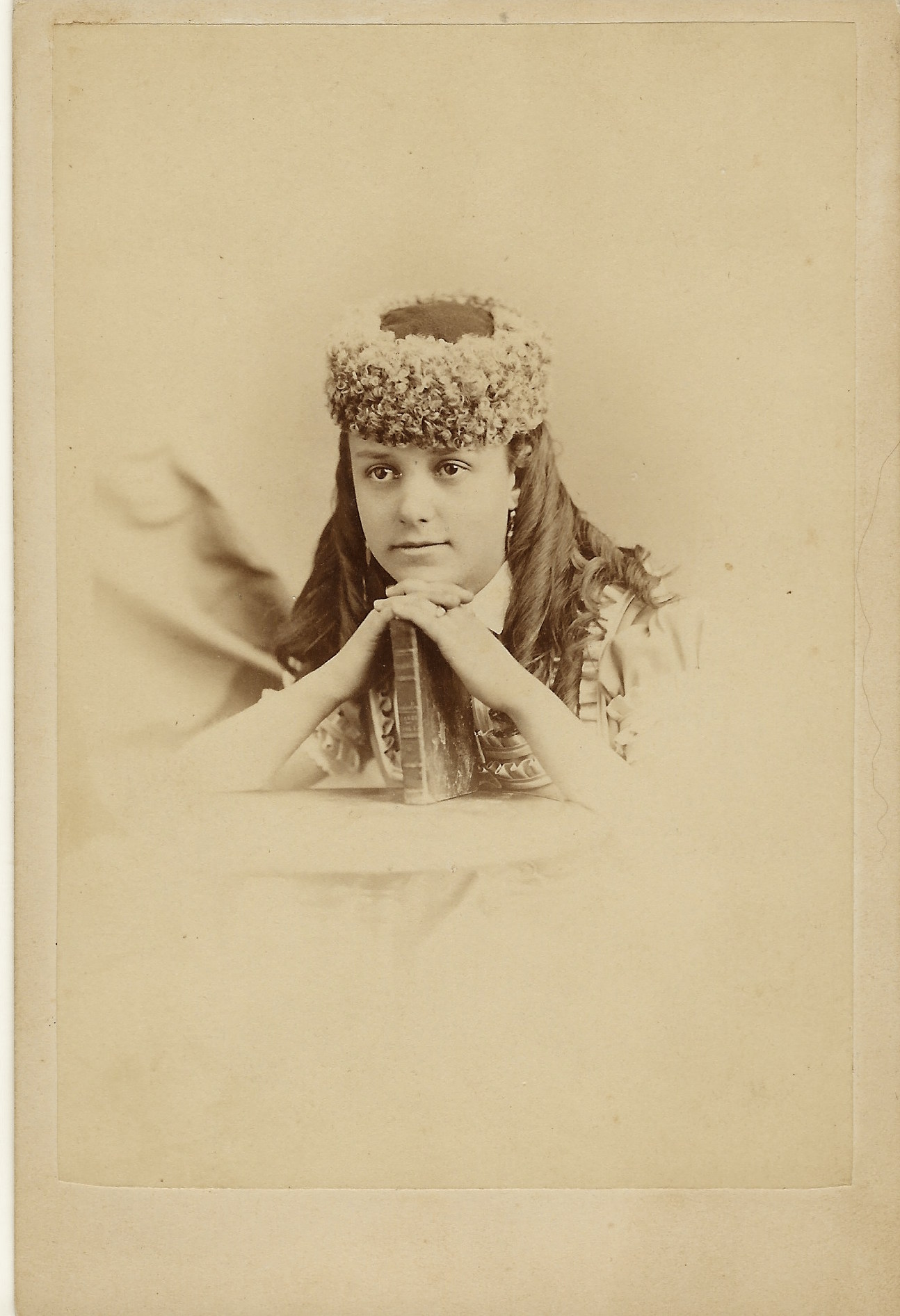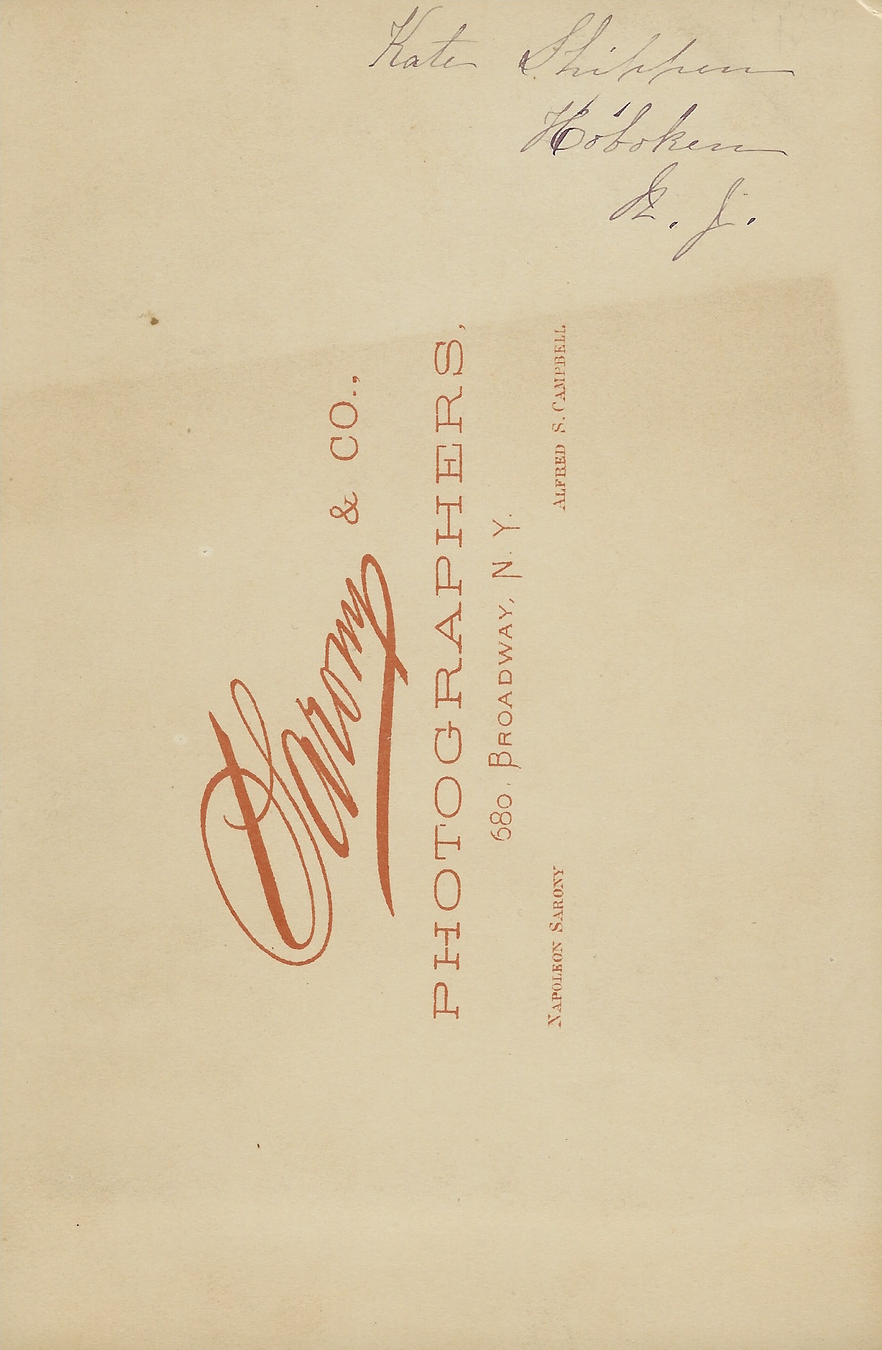 It is not infrequent that a cabinet card presents an interesting mystery. This cabinet card, by celebrity photographer Napoleon Sarony of New York City, conjures up some fascinating questions. Is the woman in this photograph a member of one of America’s most famous political families? It is likely that the pretty woman with the dreamy gaze seen in this photo is a Roosevelt. Let me tell you a little about Kate Shippen Roosevelt (1855-1925). In 1883, Kate Shippen Roosevelt (1855-1925) was married to Hilborne Roosevelt who was a world famous organ maker. He had factories in New York City, Philadelphia, and Baltimore. His company made some of the finest and largest pipe organs in the world. He designed the first electric organ and he was a first cousin to President Theodore Roosevelt. Kate was the daughter of William W. Shippen who was the president of the Hoboken Land and Improvement Company and Hoboken Ferry Company. It is not a surprise that their wedding was called by the New York Times (1883) the event of the season. An article in Town Topic Journal of Society (1883) announces that Kate Shippen Roosevelt would be performing a monologue and that she was one of the “best amateurs” engaged in such performances. Kate was also a well known women’s suffrage critic. She called suffragettes “soapbox militants”. Hillborne Roosevelt died in 1886 at age 37. He left his widow and three year-old daughter quite wealthy and they continued to be part of high society in New York City. I believe that that the woman in this image is Kate Shippen Roosevelt because 1) the inscription on the reverse of the image is supportive (see below), 2) Mrs. Roosevelt was a member of society and Sarony was a society photographer, and 3) My research was unsuccessful to find another celebrity sharing the name “Kate Shippen”. Unfortunately, I could not find a photo to confirm or disconfirm that the subject of this cabinet card portrait was Mrs. Roosevelt. The bottom image is the gravestone of Kate Shippen Roosevelt which is located at Green-Wood Cemetery in Brooklyn, New York. SOLD