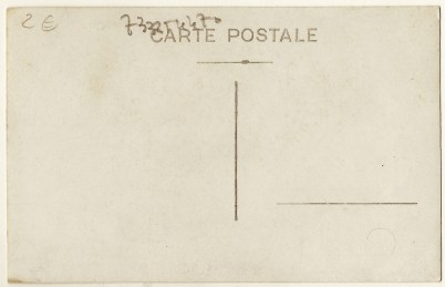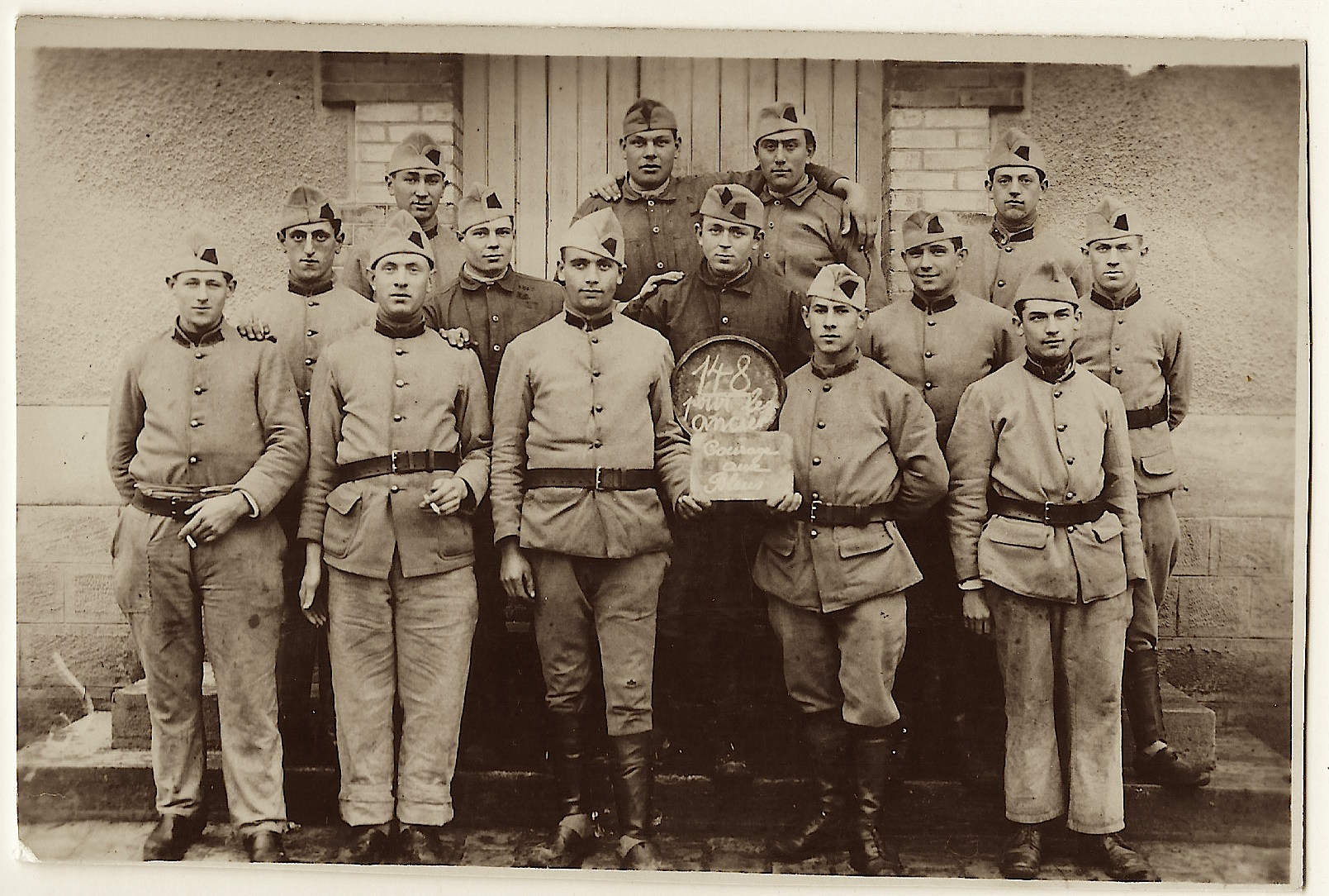 This vintage real photo postcard features a group of World War I era French soldiers. Two men in the front row are holding a sign. The men are part of the 148th regiment (?). The text on the sign is related to a French military slogan that states “Honneur aux anciens, courage aux bleus”. This roughly translates to “honor to the old soldiers, courage for the rookies”. In French, “bleu” means “rookie”. The slogan refers to the historical fact that in the late 1700’s, rookies wore blue uniforms, while more veteran soldiers wore white uniforms. This vintage postcard has excellent clarity and is in very good condition.