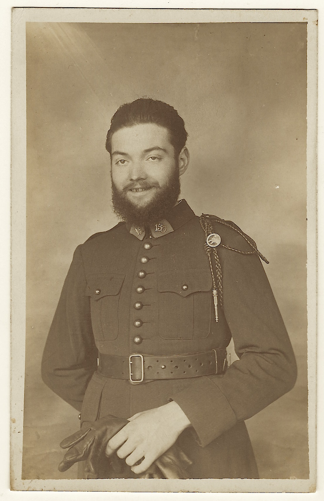 This vintage real photo postcard features a handsome French soldier. The previous owner of this photo postcard reports that the soldier is from the era of World War I. The most notable aspect of this postcard is that the soldier is wearing a French Fourragere decoration. If you look at the soldiers left shoulder, you will see a braided cord which is a Fourragere. This decoration was initiated by Napoleon I and it was given to units that distinguished themselves in battle. The award was revived during World War I. Note that the soldier’s collar holds pins indicating his honored unit was the 150th. This vintage real photo postcard is in very good condition (see scans)