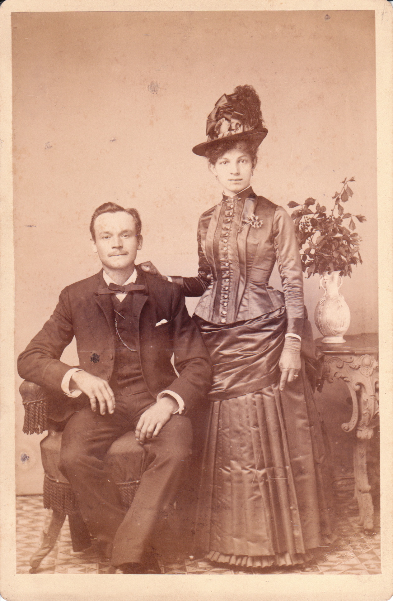 This cabinet card captures a fashionable handsome couple She is wearing a gorgeous dress and an elaborate hat with a feather. The photographer is William G. Starke and his studio was located on the corner of Main and Fifth Streets in Zanesville, Ohio. Starke operated in Zanesville from at least 1881 through 1897 and at some point, he was joined in the studio by his son, William E. Starke (1856-?).