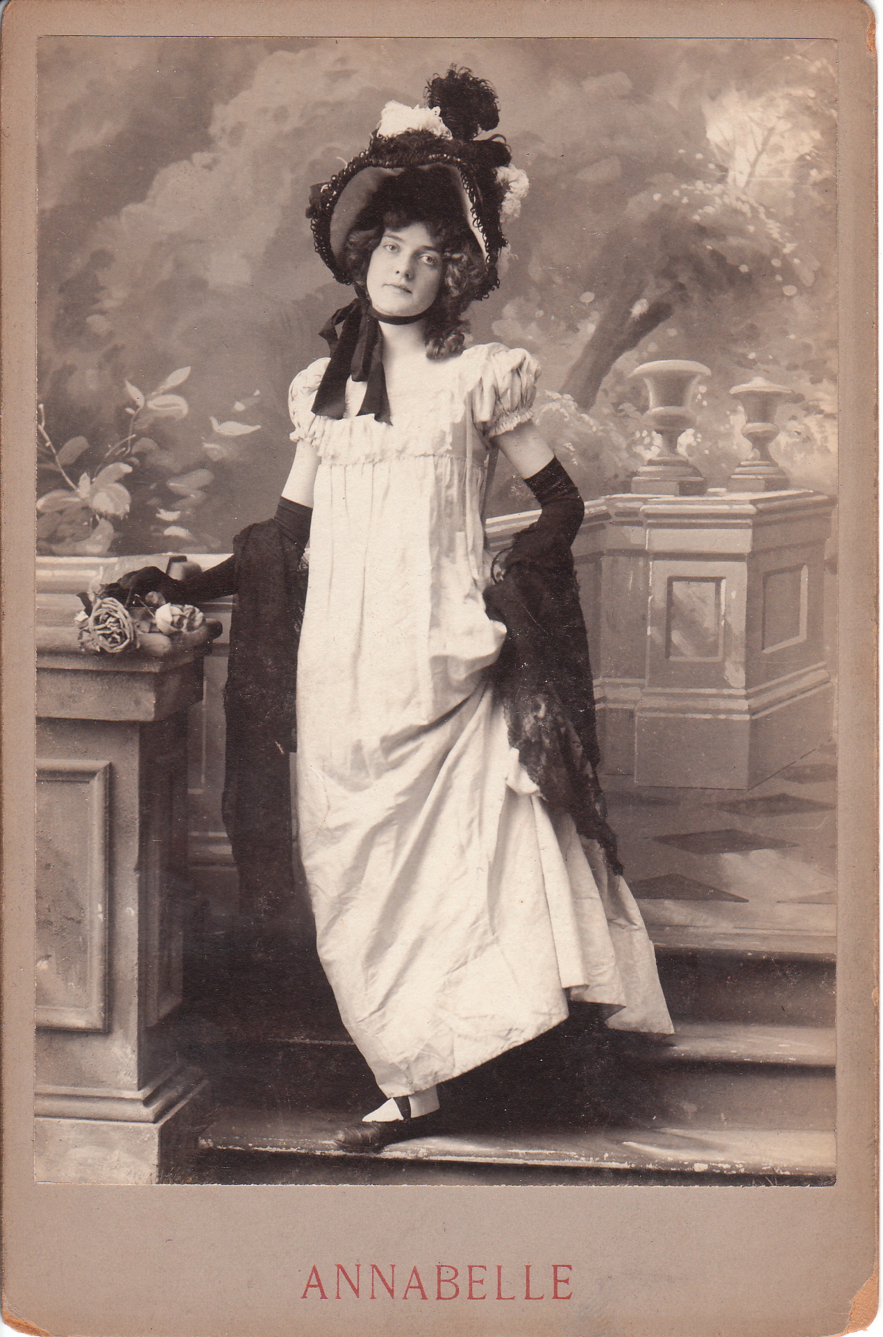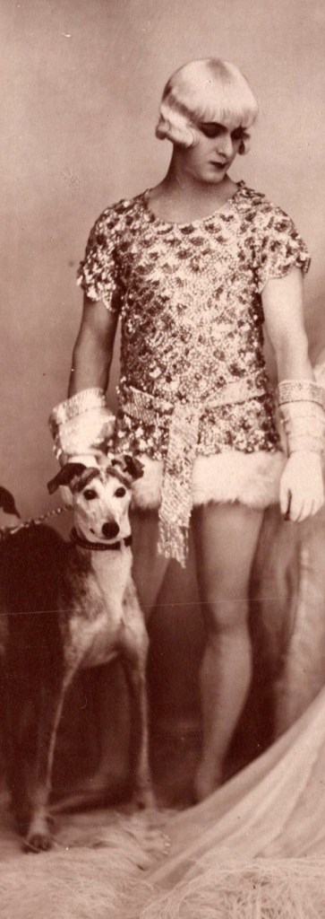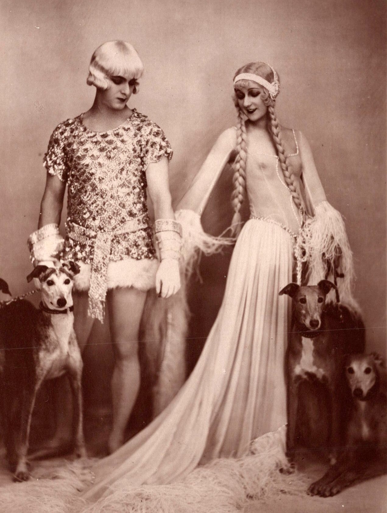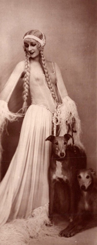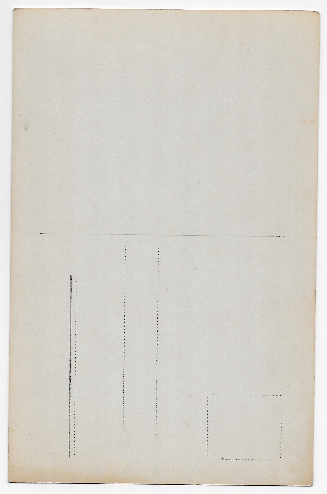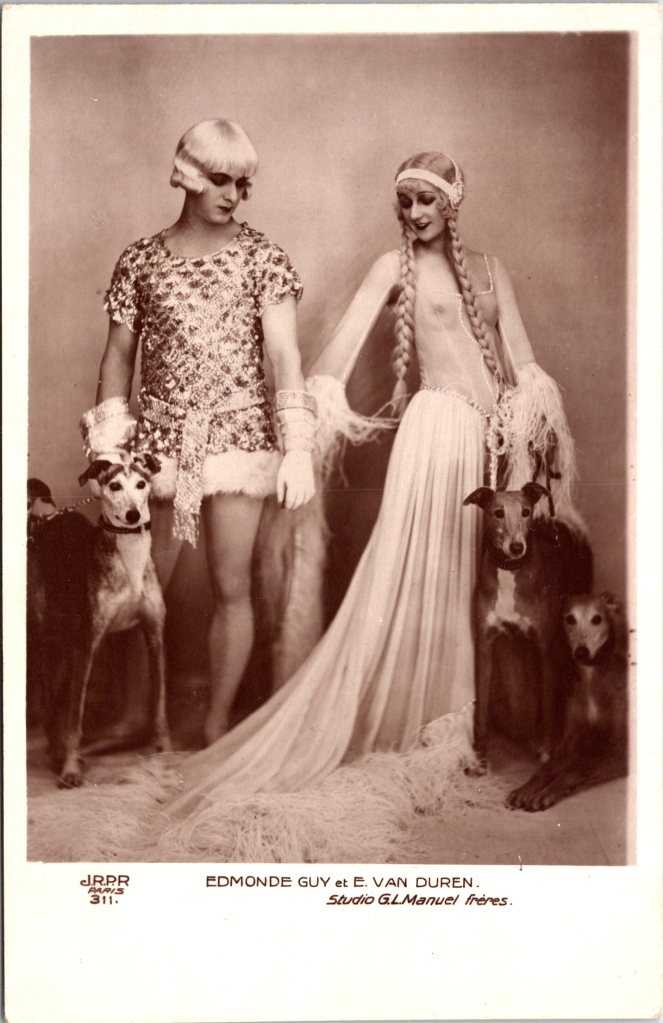 This rare risque vintage real photo postcard features famous European dance partners, Edmonde Guy (1903-1951) and Ernst Van Duren (?-1930). The pair are flanked by three regal looking greyhounds. If you look closely, you will see the dogs are leashed. Edmonde Guy was a French dancer and film actress. She also was a model for paintings by Dutch artist, Kees Van Dongen. In 1921 she and Van Duren formed a dance partnership. They performed both in Europe and the United States. In 1926, they were hired by Florenz Ziegfeld for his “Palm Beach Follies”. Guy and Van Duren were famous for their daring outfits and erotic performances. Evidence of their “steamy” work can be seen via this postcard image. Guy is wearing a sheer top, but she is virtually topless. Not much is known about Van Duren. One newspaper reported that he was Hungarian but his family was originally from the Netherlands. Besides being a dancer, he also acted. His first film role was in a French silent film in 1923. He played minor roles in a few films but his break out role was in a circus film called “Manege” (1928). He then starred in a film with Edmonde Guy, with the title “Princesse Mandane” (1928). In 1930, Van Duren committed suicide. There were rumors his self destruction was caused by the end of his relationship with Edmonde. However, some writers believe his suicide was related to his relationship with American dancer, Jack Forrest. This French postcard was published by J.R.P.R. and the photographer of the two dancers was G. L. Manuel Bros. SOLD