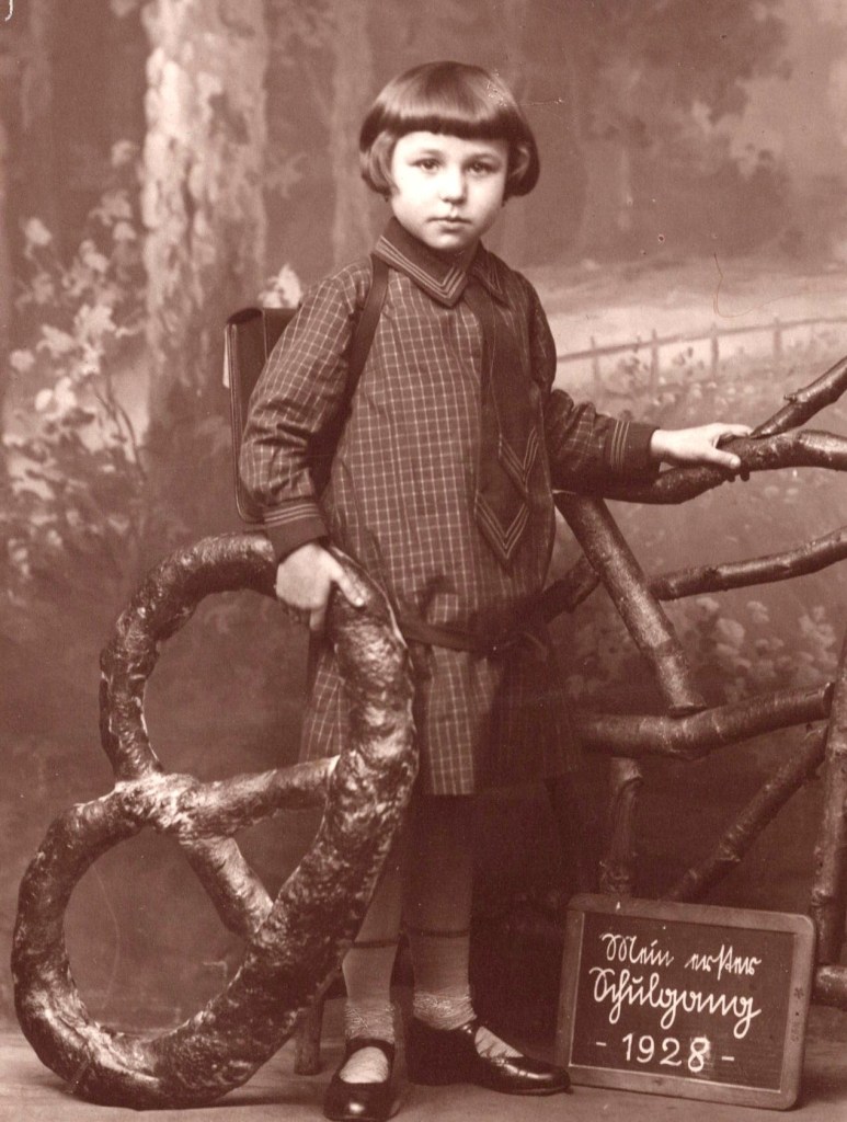 This evocative scalloped edge vintage real photo postcard captures a young school-aged child posed formally in a studio setting, dated 1928, during the late Weimar Republic period in Germany. The child stands confidently beside a sculptural studio prop resembling intertwined branches, resting one hand upon it while wearing a traditional school outfit of the era. Slung over the shoulders is a rigid school satchel (Schultasche), a detail that firmly anchors this image in everyday German childhood life of the 1920s. Most striking is the oversized pretzel-shaped prop placed prominently in the foreground. Far more than a whimsical accessory, the pretzel is a long-standing symbol in German culture, often associated with good fortune, nourishment, and childhood traditions. Its exaggerated size suggests a playful studio device meant to charm parents and relatives, blending symbolism with visual appeal.The painted studio backdrop—featuring a tree trunk and rustic fencing—adds a pastoral, storybook quality, contrasting gently with the child’s serious, composed expression. This blend of innocence and formality is characteristic of early 20th-century European studio portraiture. The sign beside the child translates as : “My First Day of School – 1928”. This inscription confirms the occasion and elevates the postcard from a simple portrait to a commemorative milestone image. Postcards like this were often produced to mark important life events—first school day, confirmations, or birthdays—and were commonly sent to extended family members. The clean, unused reverse suggests this example was preserved as a keepsake rather than mailed. The overall condition of this postcard is very good. The card has light, even age toning consistent with period silver gelatin postcards. There is minor surface wear at it’s corners. There are no creases. The image remains sharp with excellent contrast. Please review scans carefully for full condition details.